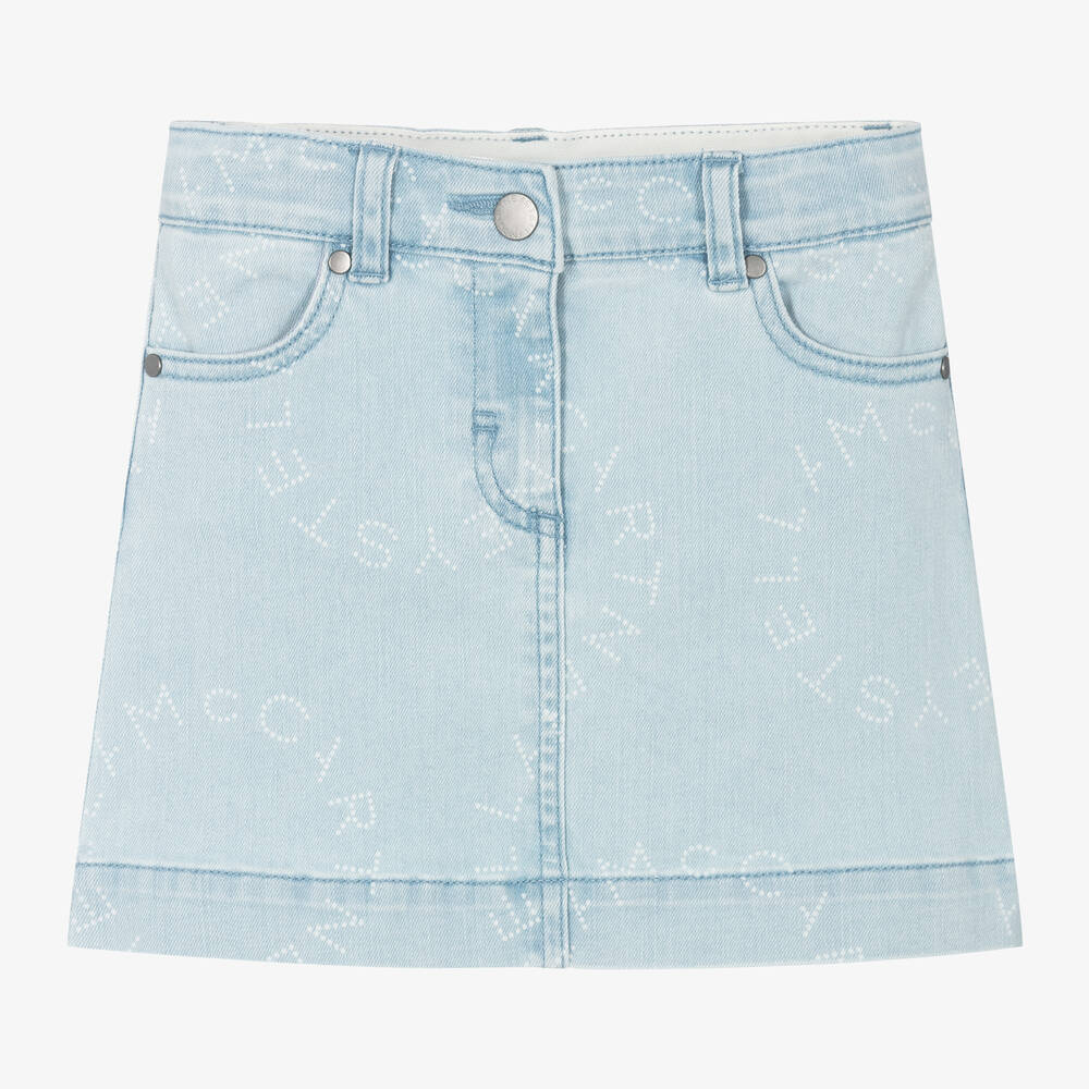A light blue skirt for girls by British label Stella McCartney Kids, made from soft and stretchy organic cotton denim. Designed in a classic A-line shape, it is patterned with circular white logos for a distinctive designer look. There are pockets on both the front and back adding to the casual look and it fastens with a zip and branded hook and bar, with an adjustable waistband to ensure a comfortable fit. The Stella McCartney fit can be quite small so choose a size up if you want room to grow.