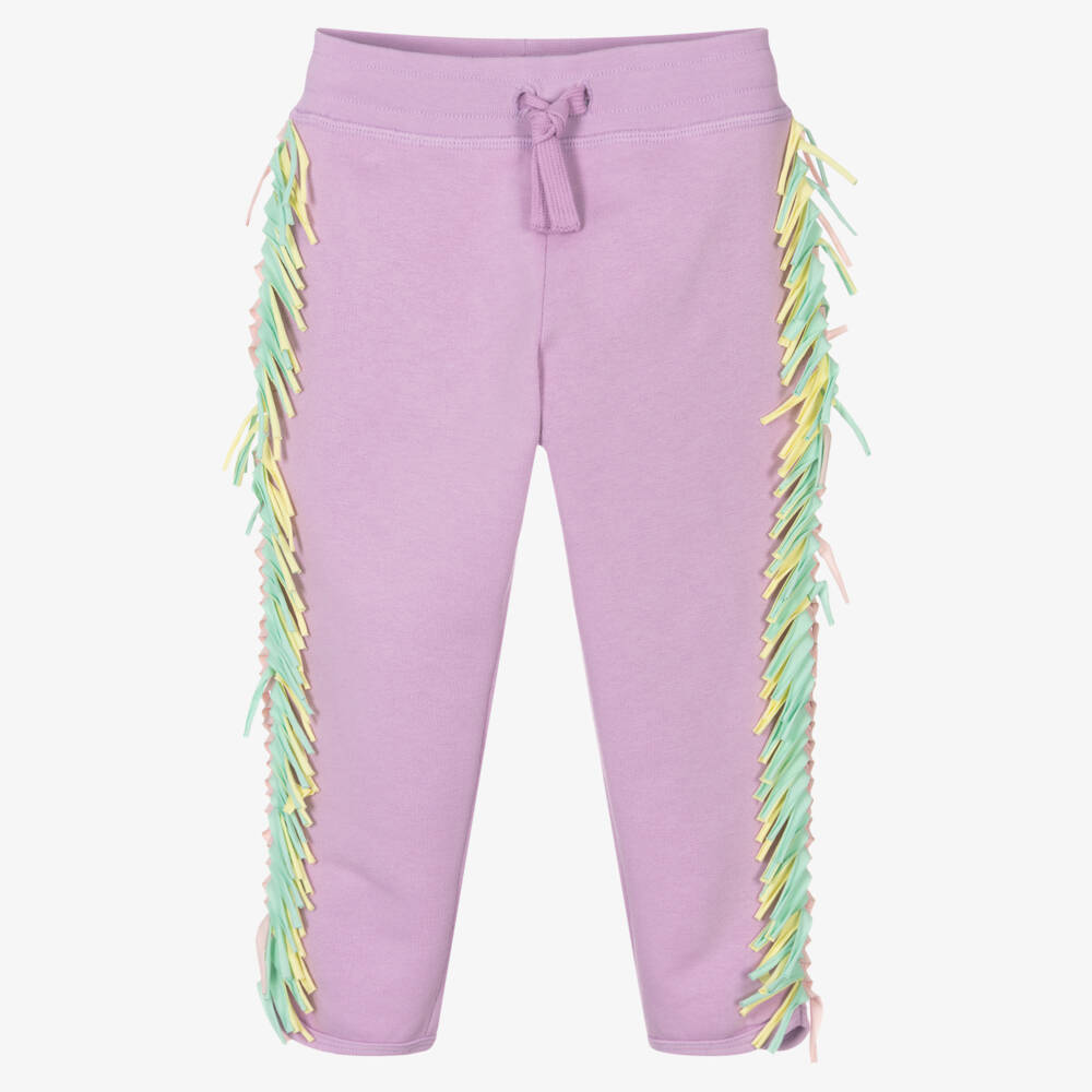 Lilac-purple organic cotton joggers for girls from Stella McCartney Kids. Gentle on the skin, these soft and comfortable joggers are made in stretchy, medium-weight jersey, with a softly elasticated, drawstring waist. The sides are trimmed with fun pastel green, pink and yellow fringing for a touch of bohemian style. Convenient side pockets complete the design. The Stella McCartney fit can be quite small so choose a size up if you want room to grow.