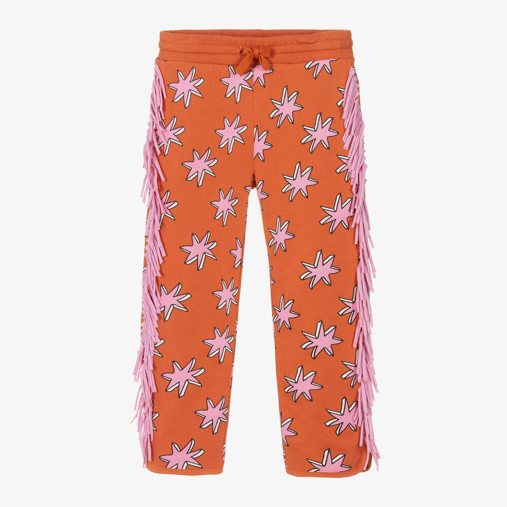 Fun orange joggers for girls by British brand Stella McCartney Kids, patterned with pink and white stars and trimmed with pink fringing. Warm and comfortable, they are made in soft, organic cotton jersey, with a cosy, fleecy inside and a drawstring waist for a great fit. They have useful, concealed pockets on the side seams. The Stella McCartney fit can be quite small so choose a size up if you want room to grow.