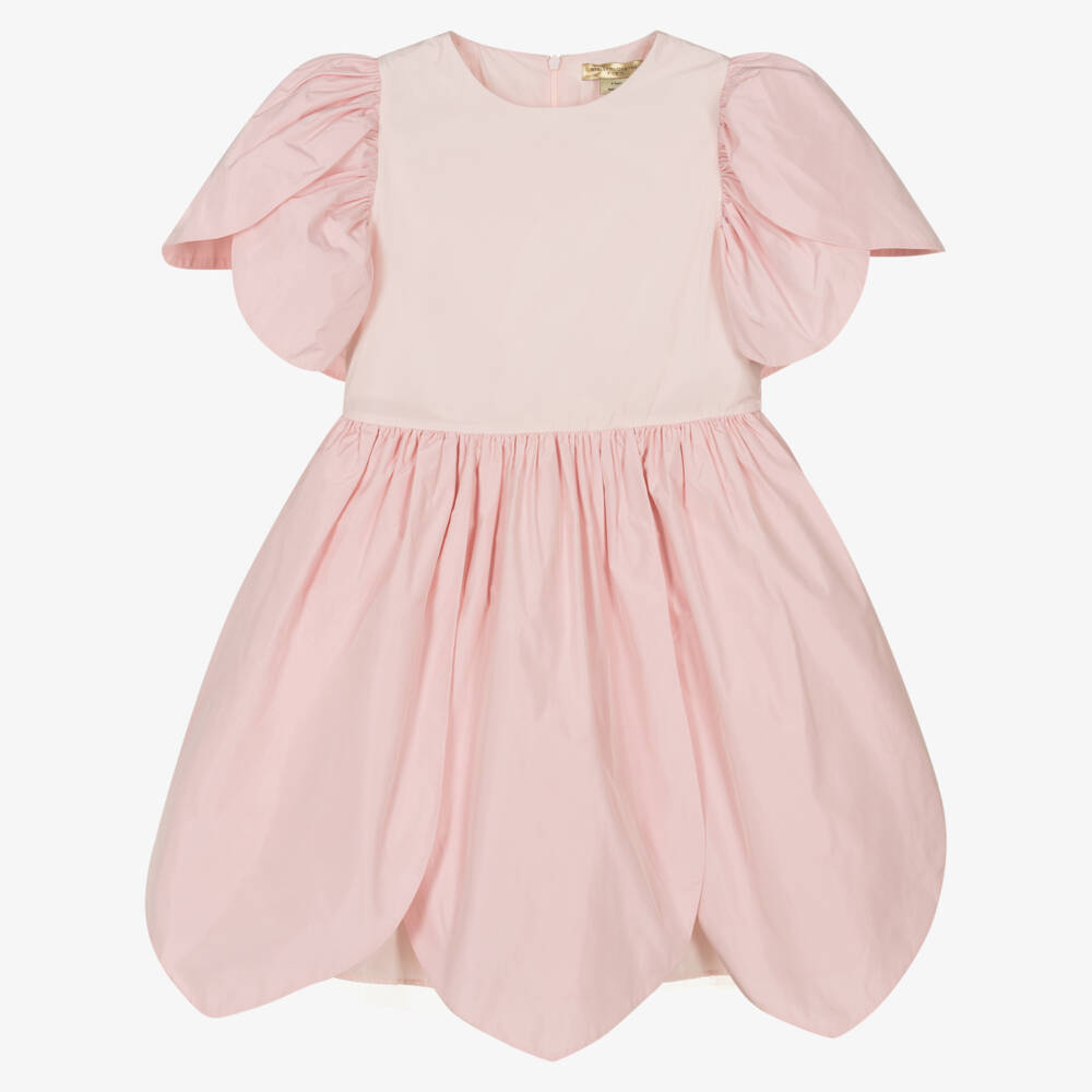A beautiful pale pink dress for girls by Stella McCartney Kids, made from recycled materials. Ideal for a special occasion, this dress has exaggerated sleeves and skirt created from layers of fabric that create a petal-like effect for a truly spectacular shape.