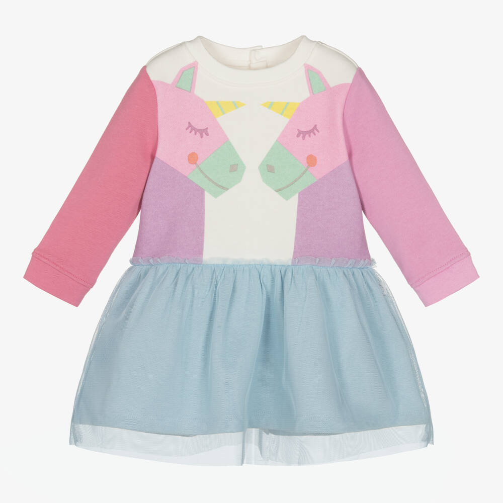 In pretty pastel shades, this sweet dress for little girls by Stella McCartney Kids is made in comfortable organic cotton jersey. The ivory bodice has a dreamy unicorn print in shades of pink and lilac that extends along the sleeves and the blue skirt has a fine tulle overlay to complete this cute look. For comfortable wear, the dress has a cosy fleece feel inside and gently ribbed trims, and fastens with poppers on the back. The Stella McCartney fit can be quite small so choose a size up if you want room to grow.