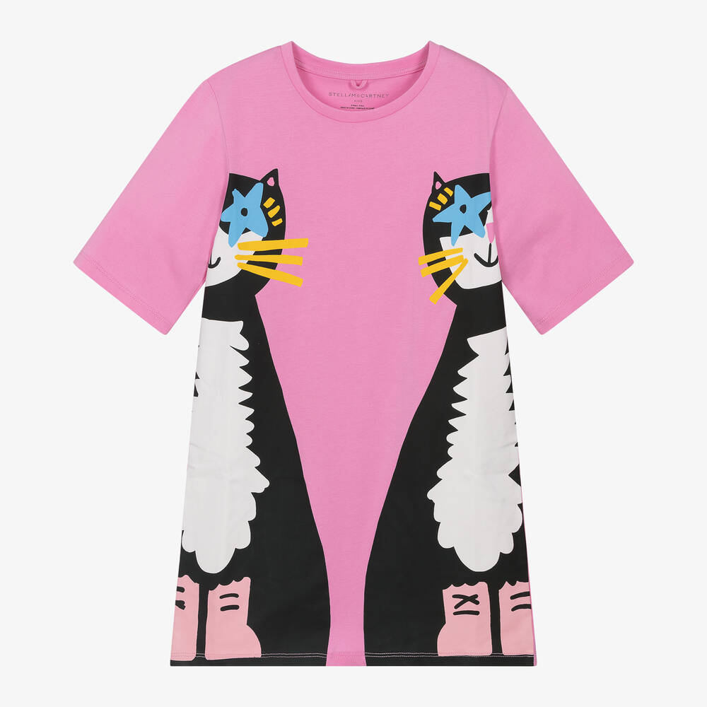 Fun pink cotton dress for girls by Stella McCartney Kids, printed with large black and white cats. Made in soft and comfortable organic cotton, it has a simple T-shirt design.