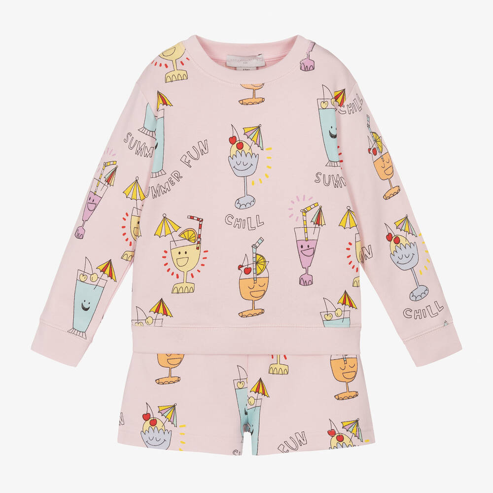 A pink sweatshirt and shorts set for girls by Stella McCartney Kids, made from soft, mid-weight organic cotton jersey. Both pieces are patterned with colourful cocktail characters, with fun slogans adding to the relaxed feel. Casually styled, the long-sleeved top has lightly ribbed trims, whilst the shorts have concealed side pockets, a patch pocket on the back and an elasticated waistband for a comfortable fit. The Stella McCartney fit can be quite small so choose a size up if you want room to grow.