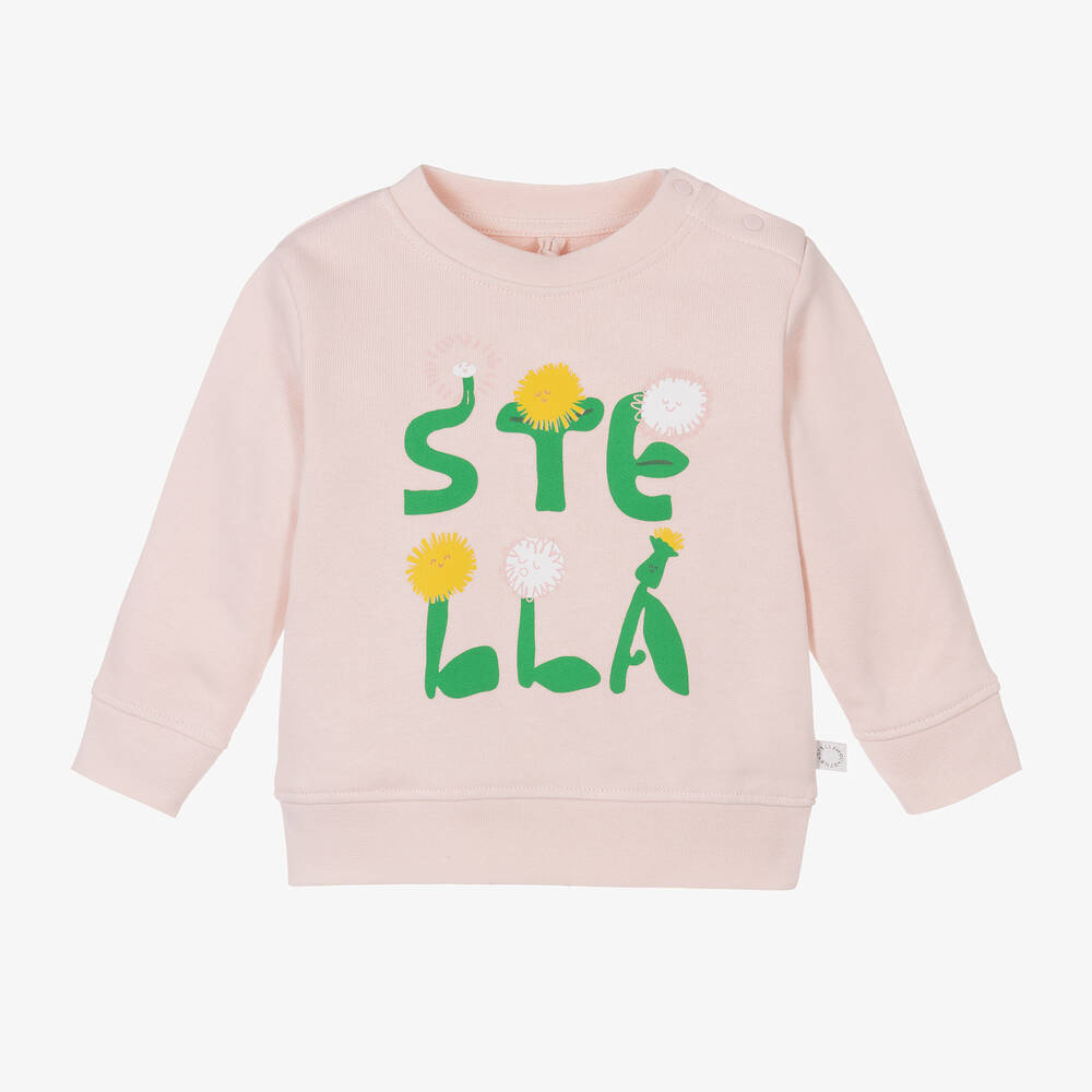 A pale pink sweatshirt for younger girls by Stella McCartney Kids, made in soft organic cotton jersey. Warm and fleecy on the inside, it is casually styled with lightly ribbed trims and popper fastenings on one shoulder. The brand's name is printed on the front in a creative pink, yellow and green floral design for a distinctive look. The Stella McCartney fit can be quite small so choose a size up if you want room to grow.