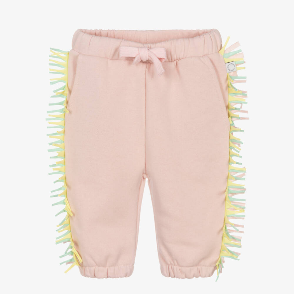 Pastel pink, yellow and green fringing adds a cute look to these pink joggers for little girls from Stella McCartney Kids. An easy-to-wear style, they are made in organic cotton jersey with a cosy fleece feel inside and have a drawstring waist for a comfortable fit. There are slanted pockets on the front and cuffed ankles to complete the casual look. The Stella McCartney fit can be quite small so choose a size up if you want room to grow.
