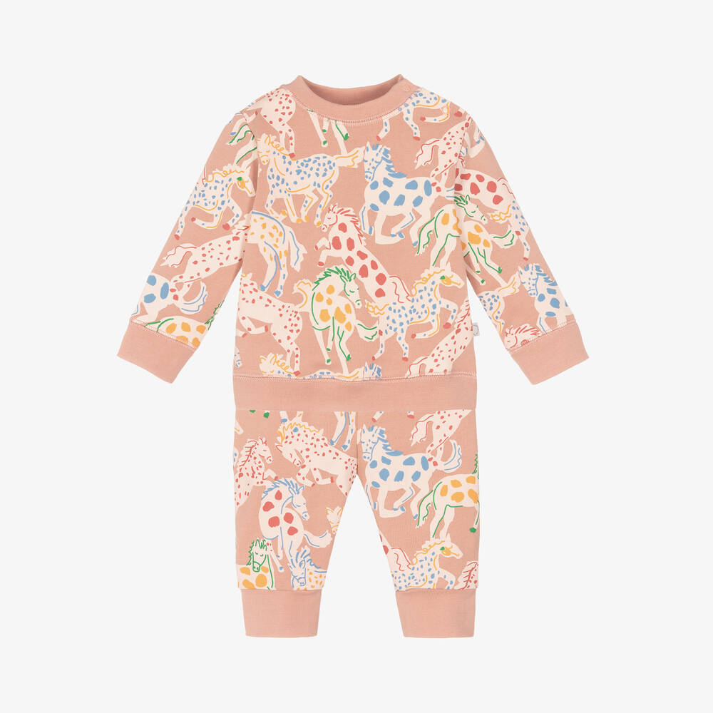 Pink tracksuit for little girls by Stella McCartney Kids, patterned with a fun and playful horse design, in yellow, green and blue. Casually styled with lightly ribbed trims, this comfortable tracksuit is made in mid-weight organic cotton jersey with a soft and fleecy inside. The long-sleeved top has popper fastenings on one shoulder and the joggers have cuffed ankles and a gently elasticated, drawstring waistband. The Stella McCartney fit can be quite small so choose a size up if you want room to grow.