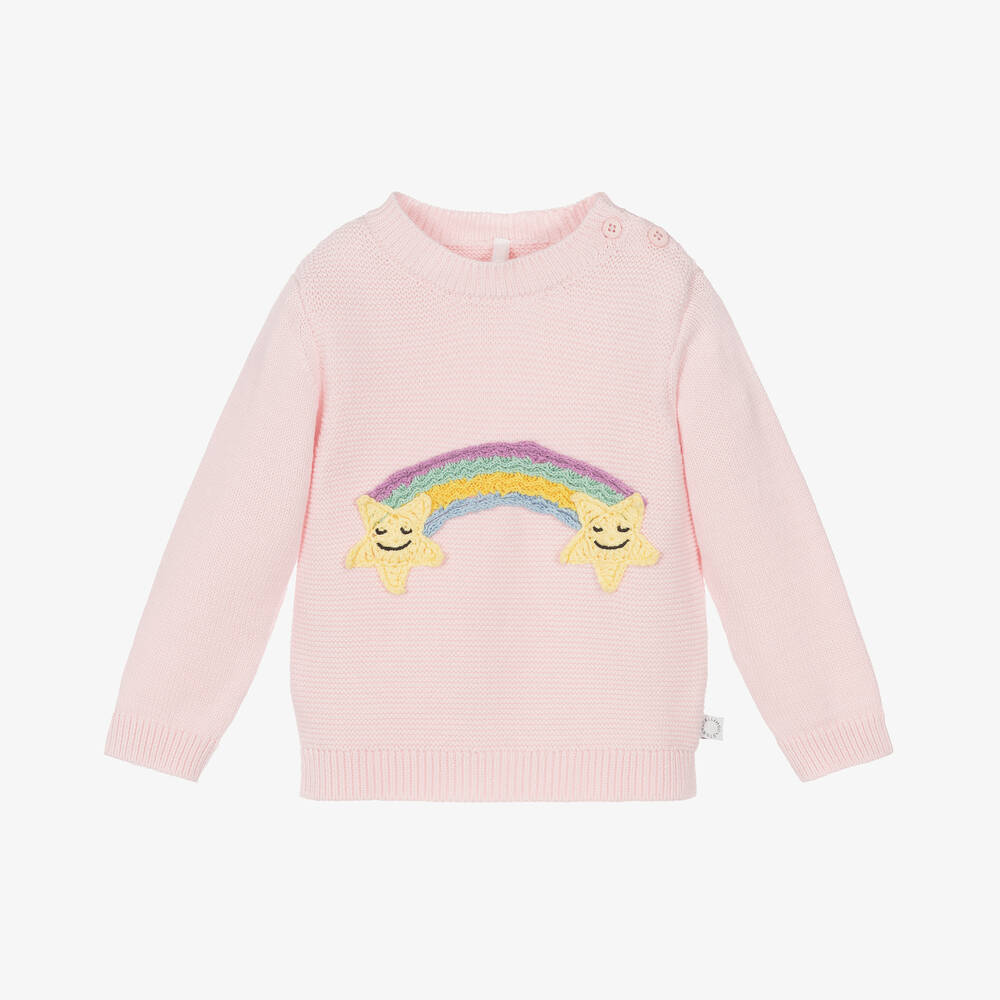 A cute pale pink sweater for little girls by Stella McCartney Kids, knitted in soft, organic cotton. Ideal for layering, this warm top has a multicoloured, knitted, rainbow appliqué on the front with yellow crochet stars at each end. Embroidered smiling faces add an extra adorable touch. Branded on the side seam, it has long sleeves, ribbed trims and useful pink button fastenings on one shoulder. The Stella McCartney fit can be quite small so choose a size up if you want room to grow.