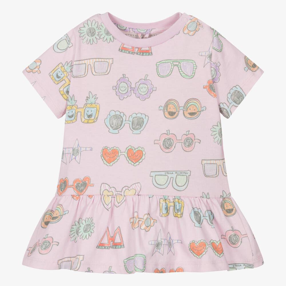 Patterned in a fun and colourful sunglasses print, this pale pink dress for little girls is by Stella McCartney Kids. It is made in soft organic cotton jersey and has a pretty gathered skirt. There are easy-fastening poppers on one shoulder to assist with dressing. The Stella McCartney fit can be quite small so choose a size up if you want room to grow.