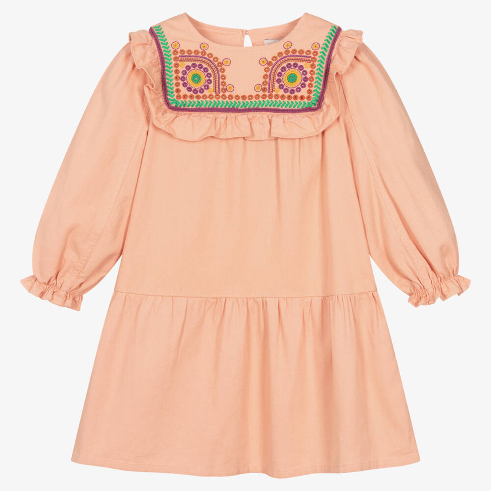 Pretty pink organic cotton dress for girls by British designer Stella McCartney Kids. Beautifully embroidered with a circle design on the frilled bodice, it has a home-spun, folklore feel. It is made in lightweight twill, with frilled, gently elasticated cuffs, a drop-waisted, gathered skirt and a keyhole, logo button fastening around the back. The Stella McCartney fit can be quite small so choose a size up if you want room to grow.