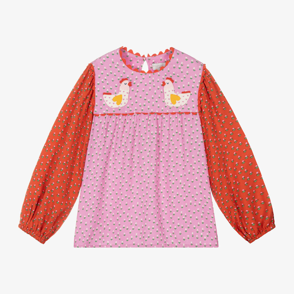 A lovely pink and flame-red blouse for girls by Stella McCartney Kids, patterned with little white pink and green flowers. Soft, flowy and comfortable, it is made from sustainably sourced viscose. This relaxed-fit top is decorated with two cute chicken appliqués and scalloped trims for a sweet vintage look. It has a single button fastening on the back and the gently puffed long sleeves are elasticated on the cuffs.