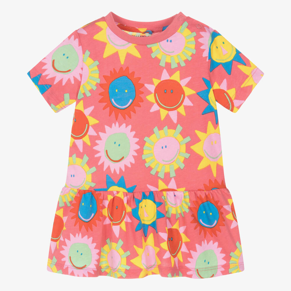 Dusky pink short-sleeved dress for younger girls by Stella McCartney Kids. Patterned with a charming sun and subtle logo print, this colourful dress is soft and gentle on the skin thanks to its organic cotton fabric. It fastens with neat poppers on the shoulder for ease of dressing. The ruffle hem adds a little flounce to the cute design. The Stella McCartney fit can be quite small so choose a size up if you want room to grow.