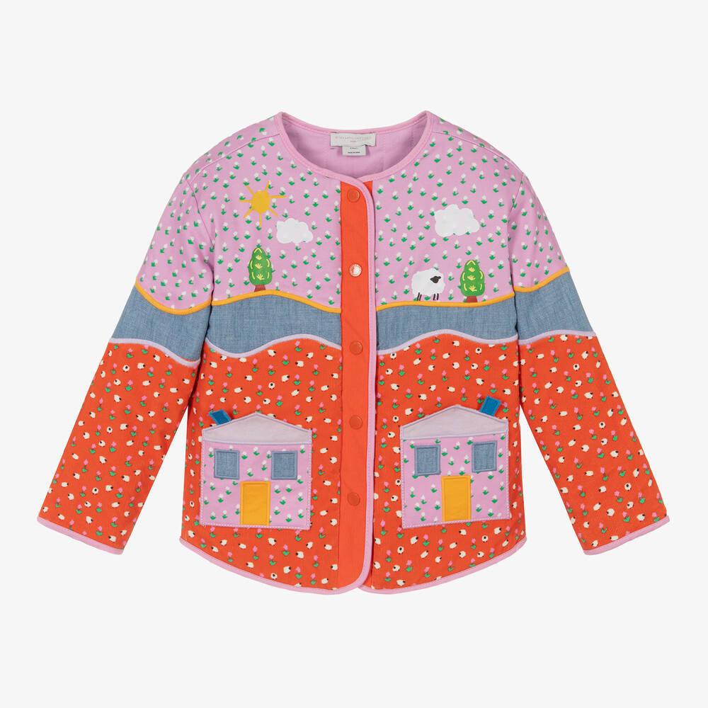 Vibrant pink and flame red quilted jacket for girls by Stella McCartney Kids. This collarless jacket is made from a combination of soft twill, chambray and needlecord with a soft and lightly quilted cotton lining and logo branded poppers for easy fastening. It is designed in a cute farmhouse theme with flower and sheep prints, patchwork appliqués and embroidered detailing. The Stella McCartney fit can be quite small so choose a size up if you want room to grow.