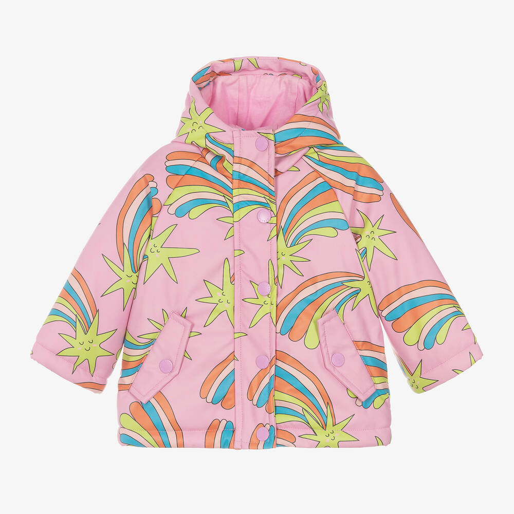A fun, pink raincoat for little girls by Stella McCartney Kids, made in a smooth recycled fabric and lined in soft jersey. Lightly padded and patterned with a colourful shooting star print, this practical coat has a fixed hood, flap pockets and a zip on the front concealed beneath a branded popper fastening placket. The Stella McCartney fit can be quite small so choose a size up if you want room to grow.