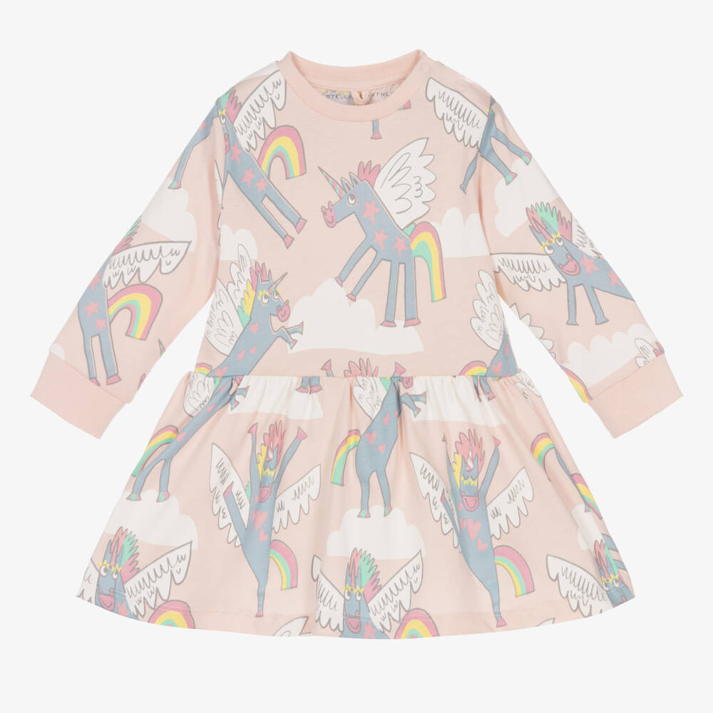 Pale pink dress for little girls from Stella McCartney Kids, with a playful unicorn print in lovely pastel shades. Super soft and comfortable to wear, it is made in organic cotton jersey and has popper fastenings on one shoulder to help with dressing. The Stella McCartney fit can be quite small so choose a size up if you want room to grow.