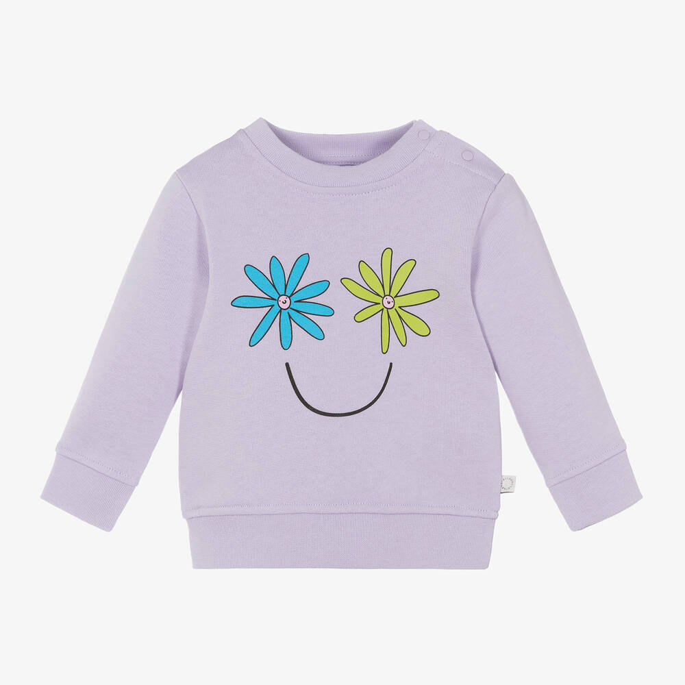 A lilac purple sweatshirt for younger girls by Stella McCartney Kids, made in soft organic cotton jersey. Warm and fleecy on the inside, this casual long-sleeved top has a smiling face printed on the front, with blue and green flower eyes for a fun and playful look. It has lightly ribbed trims and poppers on one shoulder for easy dressing. The Stella McCartney fit can be quite small so choose a size up if you want room to grow.