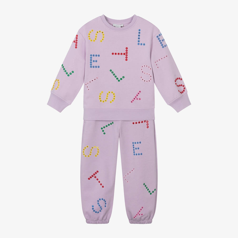 Casual and comfortable for girls, this lilac purple tracksuit is by Stella McCartney Kids. Made in soft organic cotton jersey with a warm fleecy inside, it features colourful embroidered logo letters for designer appeal. The sweatshirt has a crew neckline and stretchy ribbed trims. The joggers have a gently elasticated waist and ankle cuffs, with useful side seam pockets and two additional pockets on the back. The Stella McCartney fit can be quite small so choose a size up if you want room to grow.