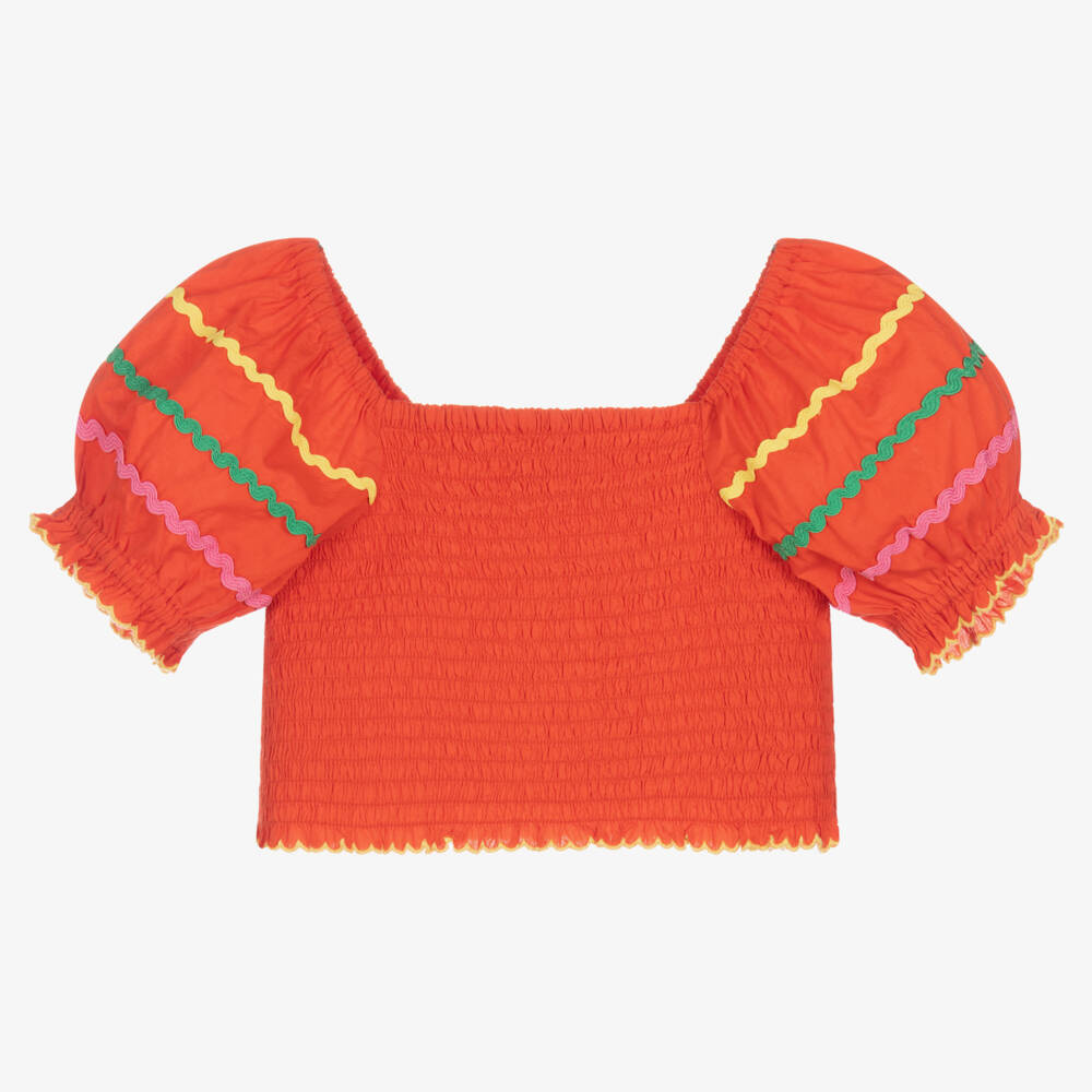 Girls bright red puff-sleeved top by Stella McCartney Kids. Made in soft organic cotton poplin, this colourful blouse can be worn off the shoulder for a laid-back festival vibe. There are contrast ric rac trims in yellow, green and pink, with a stretchy shirred bodice for fit. The Stella McCartney fit can be quite small so choose a size up if you want room to grow.