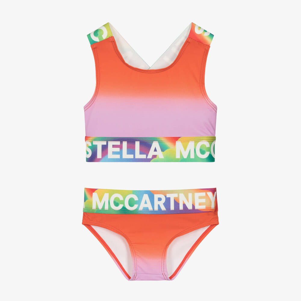 A stylish red and pink ombré bikini for girls by Stella McCartney Kids, with UPF50+. Silky smooth and stretchy for comfort, both pieces are trimmed with rainbow-patterned tape featuring the British designer's bold white logo. The Stella McCartney fit can be quite small so choose a size up if you want room to grow.