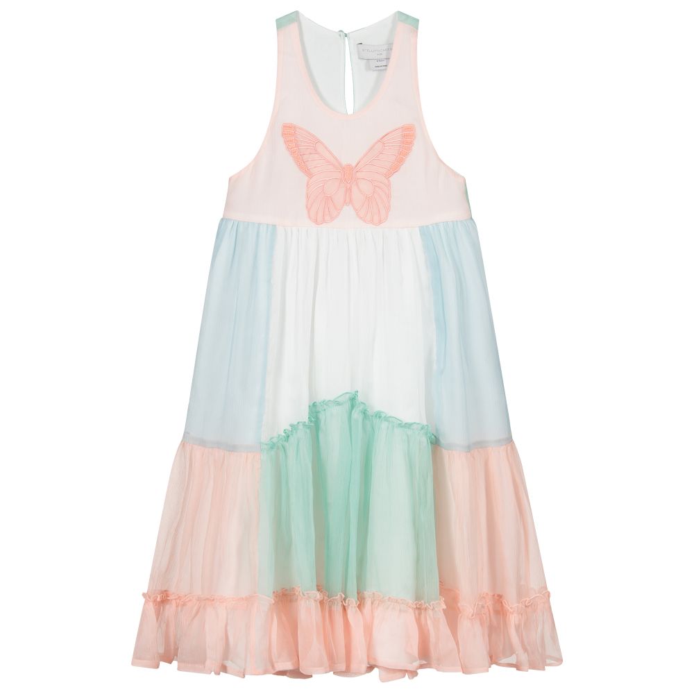 Beautiful silk chiffon dress by Stella McCartney Kids, in pretty colour blocks of pink, white, blue and green. It has a butterfly appliqué on the chest and for superior comfort, it is lined with viscose.