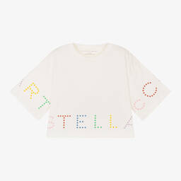 From British brand Stella McCartney Kids, an off-white T-shirt for girls, made from soft organic cotton jersey. Designed with a relaxed, boxy fit and a crew neckline, the short sleeves and hem are trimmed with a colourful dotted logo for a cool designer finish.