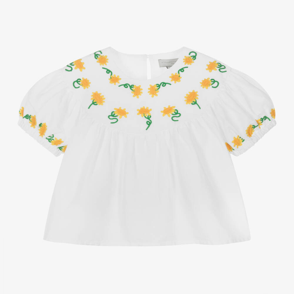 A lovely white blouse for girls by Stella McCartney Kids, made in a lightweight linen and cotton blend. Styled in a comfortable loose fit, this pretty top is embroidered with pretty yellow and green sunflowers. There are elasticated cuffs on the short sleeves and it fastens neatly on the back with a single button. The Stella McCartney fit can be quite small so choose a size up if you want room to grow.