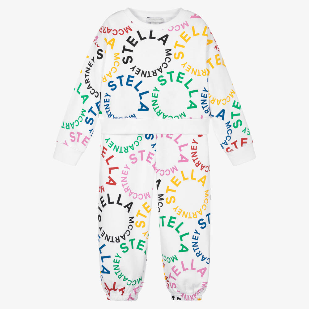 A casual white tracksuit for girls by Stella McCartney Kids, made from soft organic cotton jersey. The brand's signature logo is reimagined in a multicoloured circular design, adding vibrance and fun to the look. Super cosy on laid-back days, the joggers have elasticated trims and three-pocket styling. The Stella McCartney fit can be quite small so choose a size up if you want room to grow.