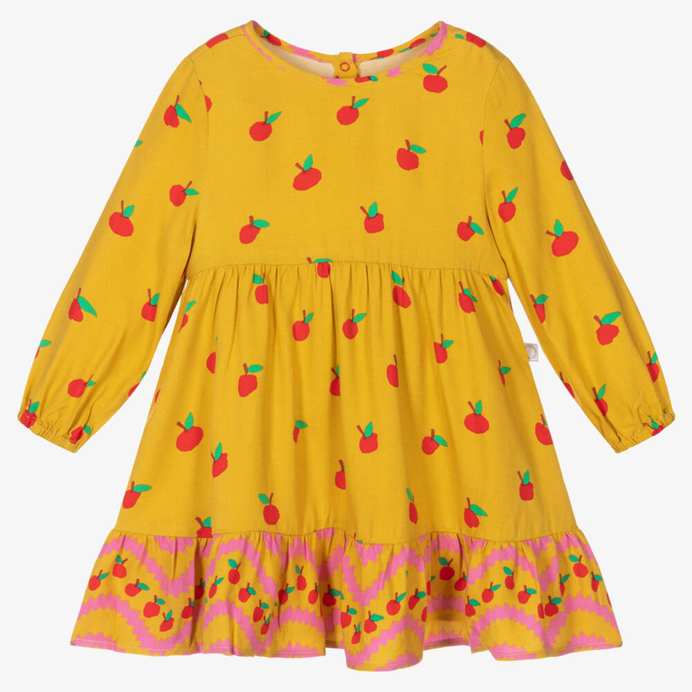 Sweet mustard yellow dress for little girls by Stella McCartney Kids, with a red apple print and pink zigzag striped trim. Made in soft and lightweight viscose twill, it has a gathered skirt with a ruffled hem, gently elasticated cuffs, and easy popper fastenings on the back. The dress has matching knickers and a branded tab on the side seam for a discreet designer finish.