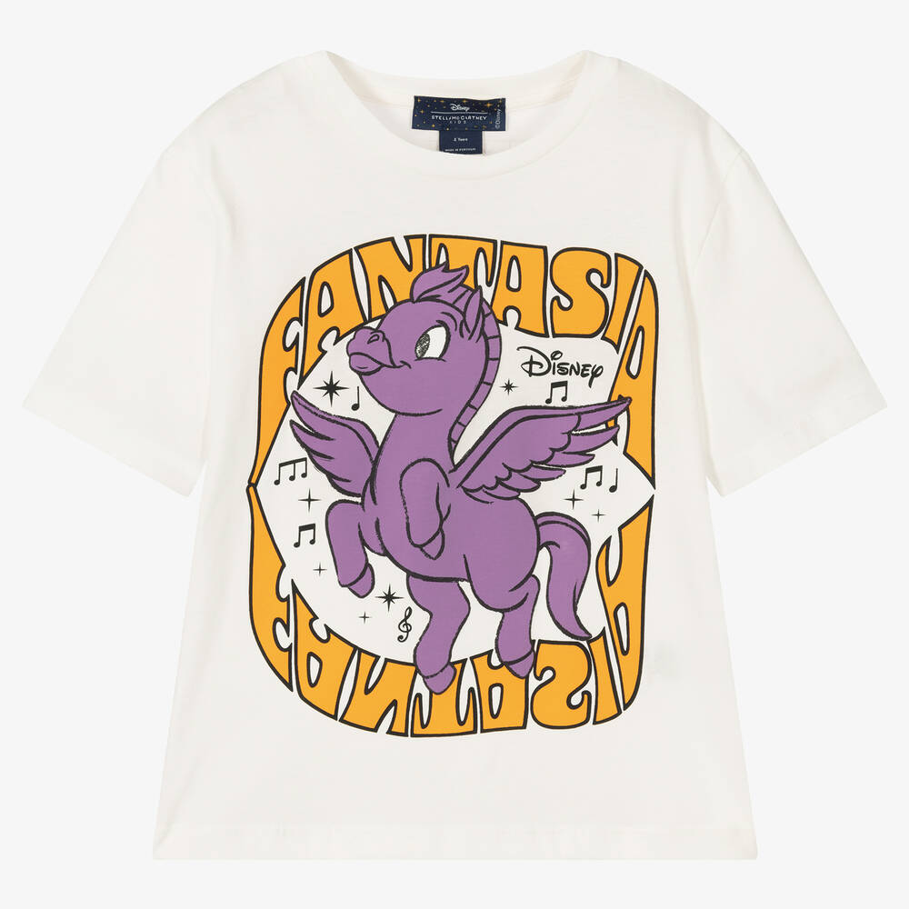 A fun ivory organic cotton T-shirt for girls from British designer Stella McCartney Kids. Forming part of Disney© Fantasia capsule collection, it has a psychedelic Pegasus graphic in vibrant lilac purple and orange. This top is made in soft and stretchy jersey, comfortable for all-day wear.