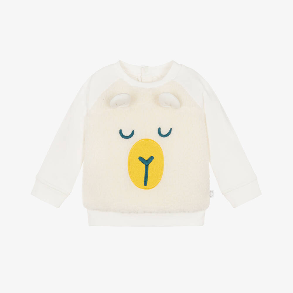 A cute ivory sweatshirt for little boys and girls by Stella McCartney Kids, made in organic cotton jersey with a soft sherpa fleece front. Branded on the side seam, this sweet design has embroidered blue and yellow features on the front with pop-up alpaca ears. It has raglan sleeves and comfortable ribbed trims for casual dressing. Easy poppers fasten on the back. The Stella McCartney fit can be quite small so choose a size up if you want room to grow.
