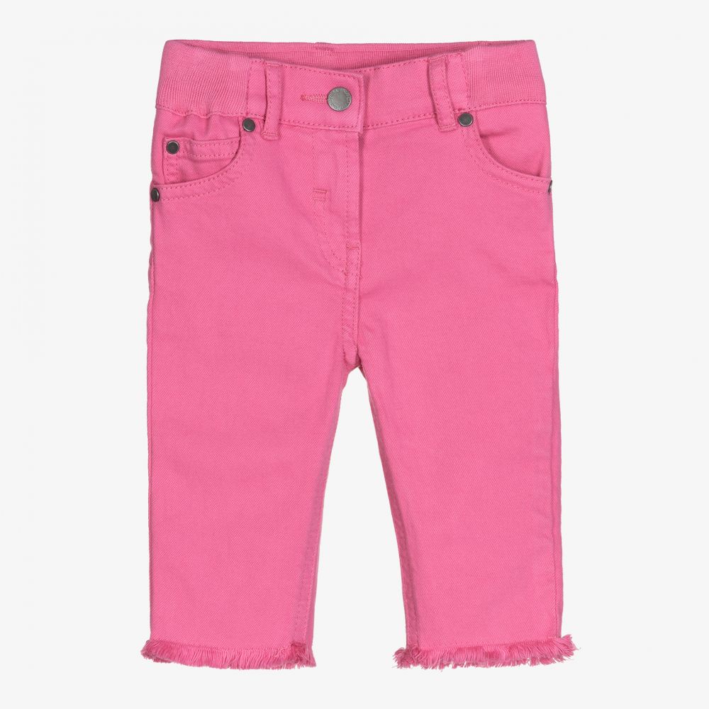 Baby girls fuchsia pink denim jeans by Stella McCartney Kids. Made in soft, mid-weight organic cotton with slight stretch, these comfortable trousers have a logo tab on the back of the elasticated waistband and branded rivets on the front. The cuffs are finished with a raw, frayed design, and there is a hook and zip fastening on the front.