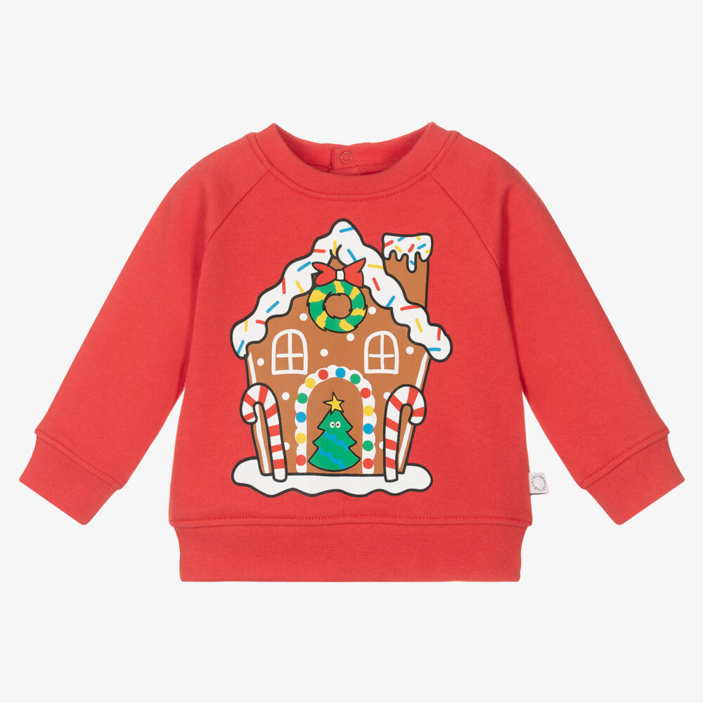 Adorable red sweatshirt for little boys and girls, designed by British brand Stella McCartney Kids. It has a colourful gingerbread house printed on the front for a sweet look. Fastening with easy-to-use poppers on the back, this item makes the festive season even more special. The Stella McCartney fit can be quite small so choose a size up if you want room to grow.