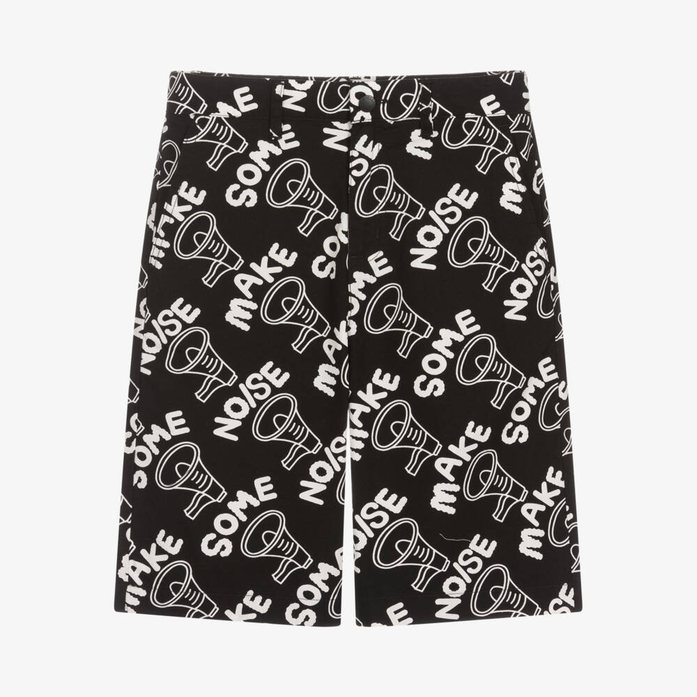 Fun black and white Bermuda-style shorts for teen boys by Stella McCartney Kids. In an eye-catching monochrome colour pallete, these organic cotton poplin shorts have a bold 'Make some noise' and loudspeaker all-over print. Fastening with classic hook and zip on the front, they have slanted pockets on the front, pockets on the back with branded black poppers and a sleek black logo tab on the back for an extra designer element. The Stella McCartney fit can be quite small so choose a size up if you want room to grow.