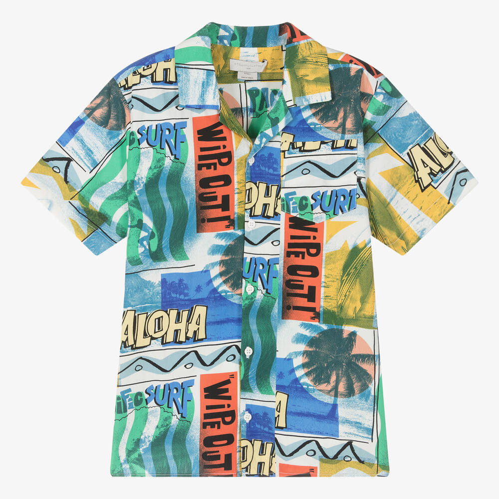 Casual blue and white organic cotton shirt for teen boys from Stella McCartney Kids. A contemporary take on the classic Hawaiian look, this cool surf-themed style is patterned with colourful palm trees, waves, 'Aloha' and various slogans. Buttoning on the front, this soft and lightweight poplin shirt is styled with a revere collar, a patch pocket and short sleeves. The Stella McCartney fit can be quite small so choose a size up if you want room to grow.