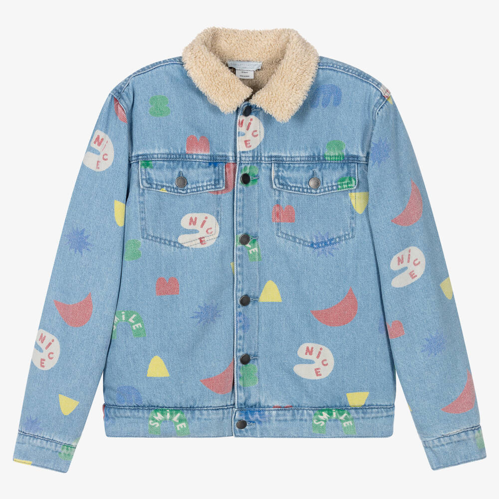 Washed blue denim jacket for teen boys by Stella McCartney Kids, with a colourful shape and slogan print. Made with organic cotton, it has a cosy teddy fleece collar and lining. There are button-fastening chest pockets and useful concealed side pockets. Branded button fastenings give a logo-inspired finish.