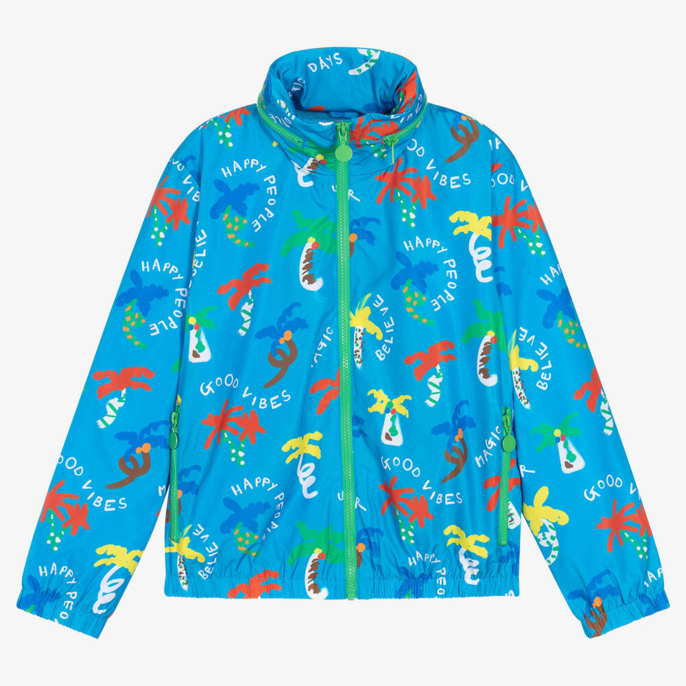 Lightweight blue jacket for teen boys by British brand Stella McCartney Kids, with a colourful tree print and positive white slogans. Made in soft, silky, recycled fibres, it has a useful fold-away hood. It is lined in lightweight, breathable mesh and has elasticated cuffs and hem for cosiness. There are exposed green zip fastenings on the front, hood and pockets, all with logo pull tabs.
