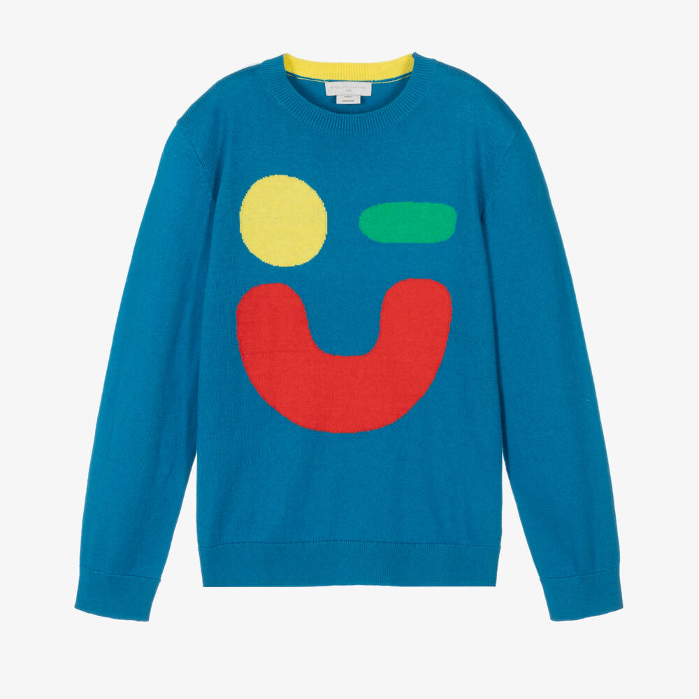 Bright blue sweater for teen boys by Stella McCartney Kids, knitted in a soft organic cotton and wool blend. The front has a colourful intarsia smiling face design, with a contrast yellow neck and green hem.