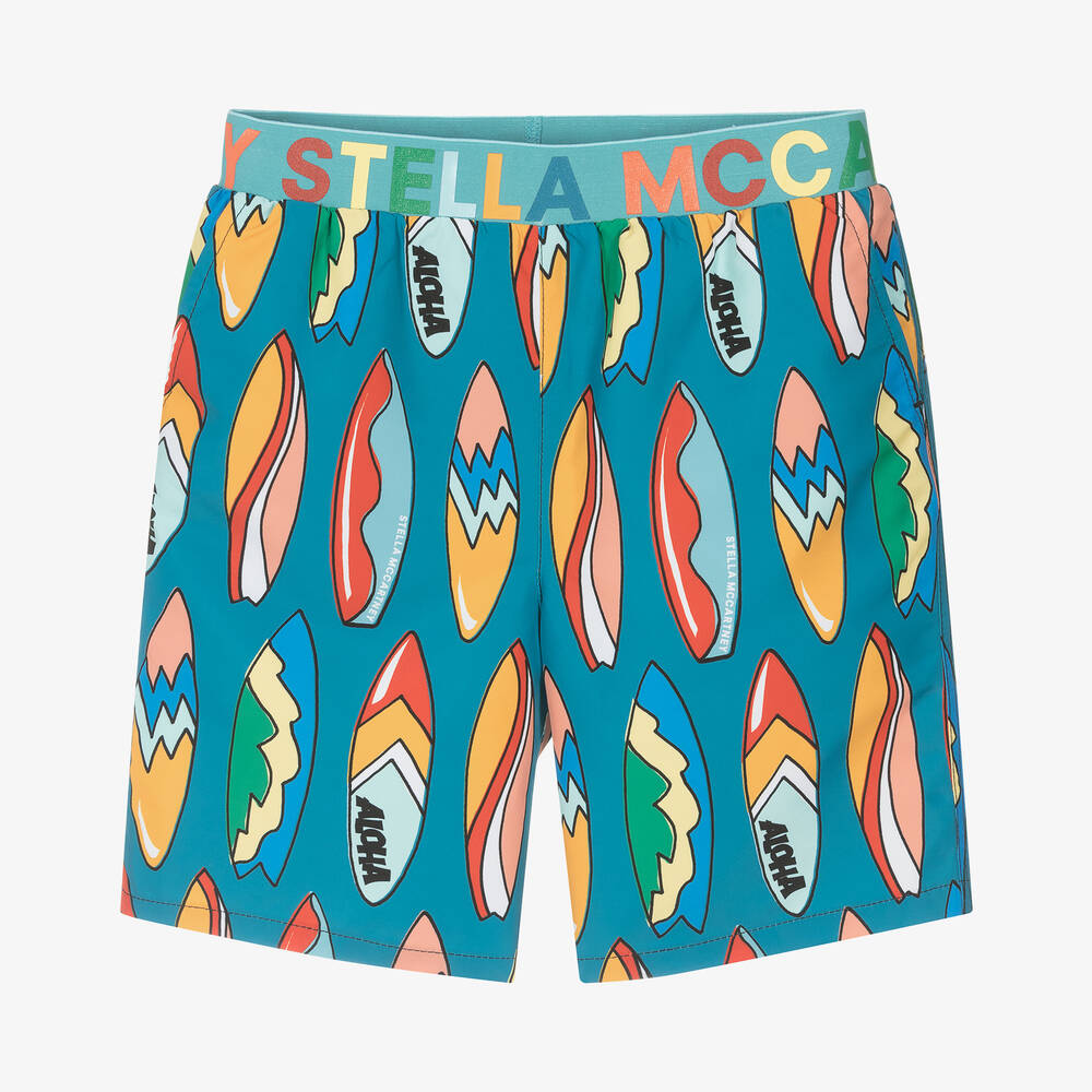 Cool teal blue swim shorts for teen boys by Stella McCartney Kids, patterned with colourful surfboards and 'Aloha' graphics. The elasticated waistband incorporates a multicoloured logo for an instant designer look. Made in silky recycled fabric with a soft mesh lining, there are two front pockets and a velcro-fastening back pocket with eyelets. The Stella McCartney fit can be quite small so choose a size up if you want room to grow.