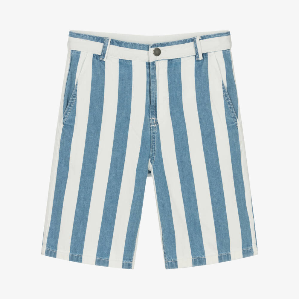 From British brand Stella McCartney Kids, blue and white denim shorts for teen boys with fun embroidered badges on the back pockets. These Bermuda-length striped shorts are made in mid-weight cotton denim and fasten with a clip and zip on the front for style and comfort. The Stella McCartney fit can be quite small so choose a size up if you want room to grow.