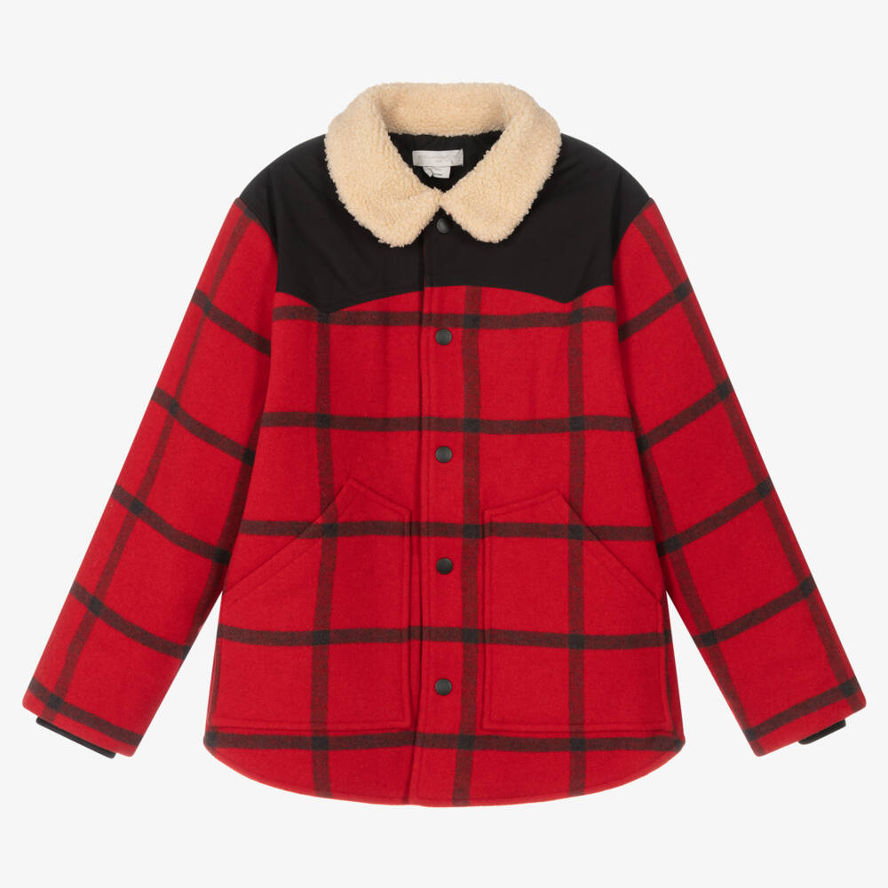 Red and black check teddy jacket for teen boys by Stella McCartney Kids. Designed in a lumberjack style in a felted wool blend fabric, it has contrast black nylon shoulder panels and ribbed wrist cuffs. The collar is made in soft, ivory faux shearling. The silky black lining is lightly quilted and comes with a popper adjustable elasticated inner band to keep in the warmth. There are two large hand pockets and practical branded popper fastenings on the front.