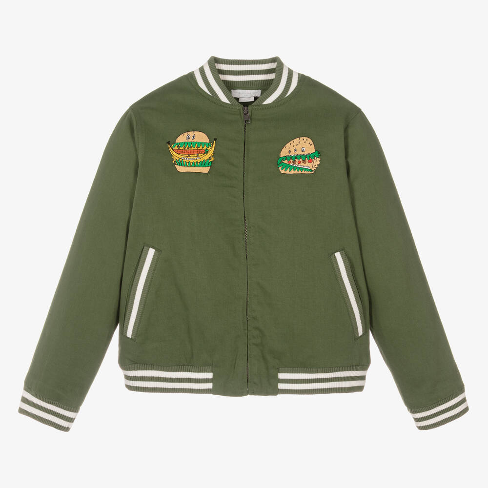 A cool khaki green embroidered bomber jacket for teen boys by Stella McCartney Kids. A reflection of the designer's love for unique designs, it has two fun burger characters on the front and a stand-out 'Hangry Monster on the Loose!' in vibrant colours on the back. There are contrasting white stripes on the ribbed trims for a varsity vibe, two front pockets and a front zip fastening. Made in mid-weight organic cotton twill, it has a slight stretch and a lightweight full lining for comfort. The Stella McCartney fit can be quite small so choose a size up if you want room to grow.