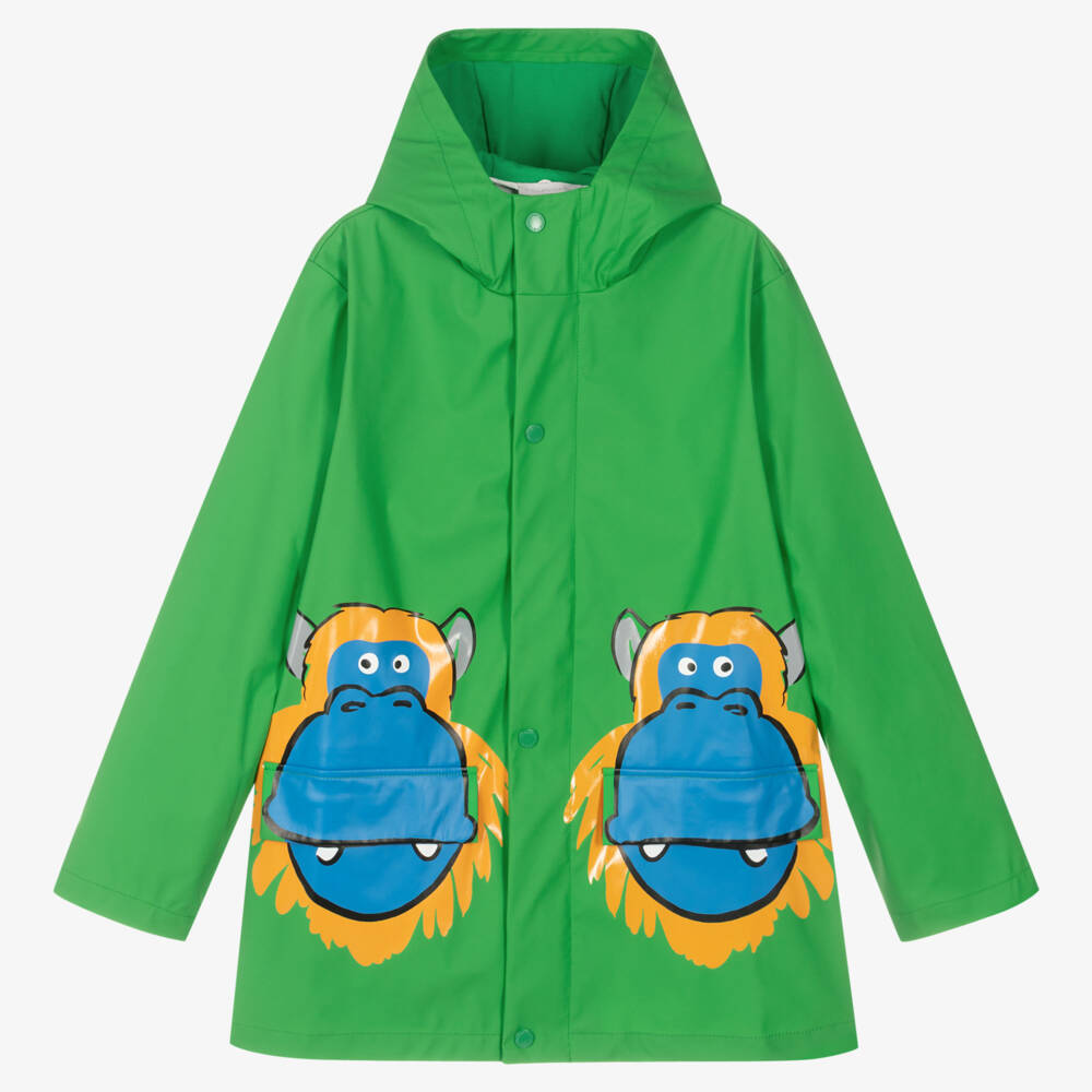 Bright green hooded raincoat for teen boys by Stella McCartney Kids, with eye-catching blue and yellow monkey prints on the front. Made in smooth coated water-repellent fabric, it fastens with a zip and branded poppers on the front and has useful flap pockets.