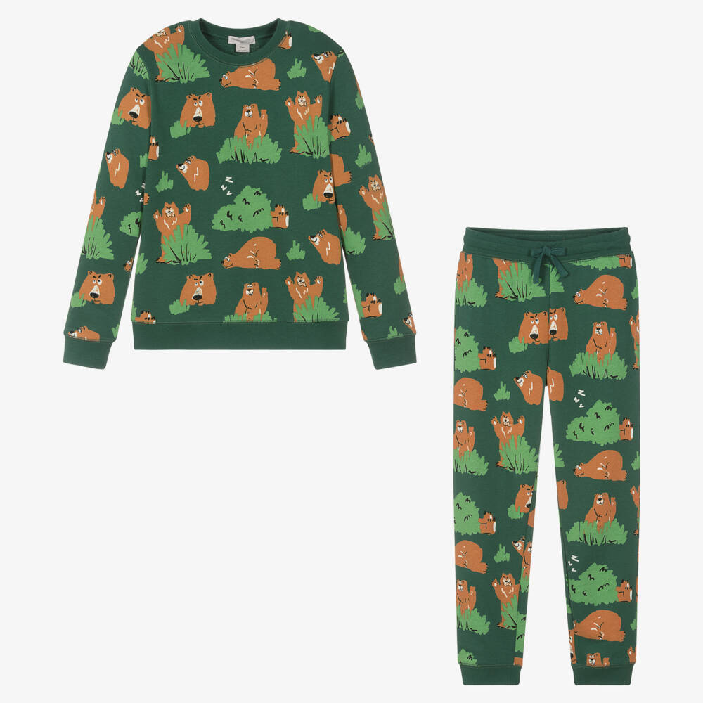 Casual dark green tracksuit for teen boys by Stella McCartney Kids, with a fun grizzly bear pattern. It is made in soft organic cotton jersey, with stretchy ribbed trims for a comfortable fit. The joggers have a drawstring waist and side pockets, with an additional back pocket that has a slit detail. The Stella McCartney fit can be quite small so choose a size up if you want room to grow.