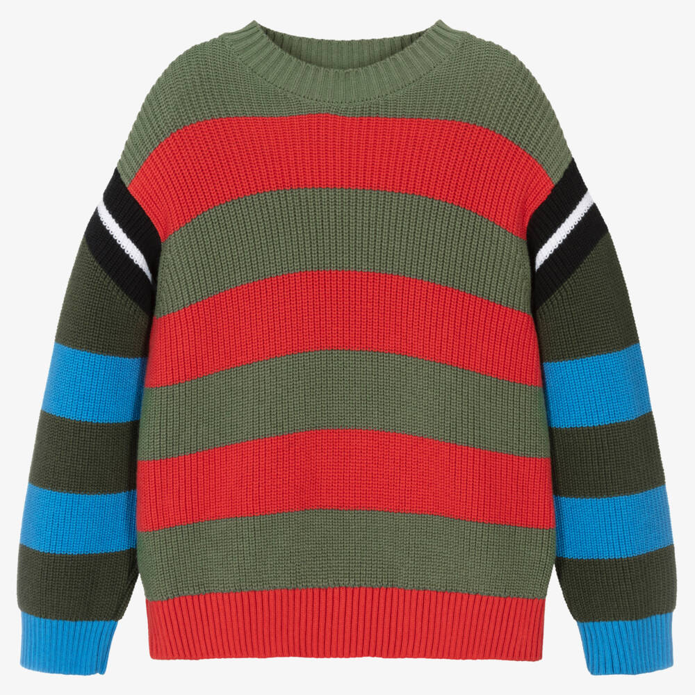 In contrasting green, red and blue stripes, this cool sweater for teen boys is from Stella McCartney Kids. Great for wearing on laid-back days, this oversized crew neck jumper is knitted in a chunky organic cotton and wool blend. The Stella McCartney fit can be quite small so choose a size up if you want room to grow.