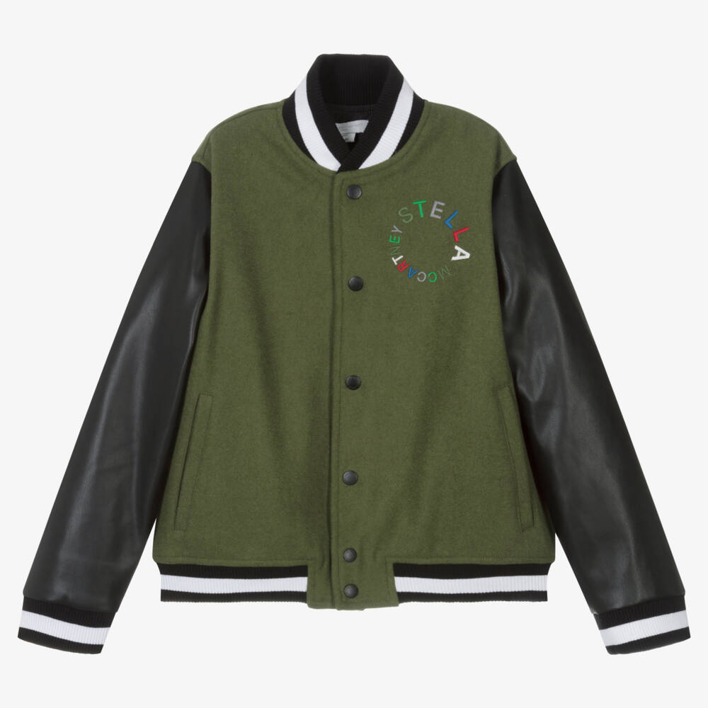 A deep green and black jacket for teen boys from Stella McCartney Kids. With striped trims, the body is made in a felted wool blend, the sleeves are smooth faux leather, and the British label's colourful branding is embroidered on the chest, adding those sports-luxe details to this varsity-style piece. A bouclé logo appliqué on the back and branded poppers on the front allow for a stand-out designer look. Made with partially recycled materials, it has a silky, quilted lining and lightweight padding for warmth and comfort. The Stella McCartney fit can be quite small so choose a size up if you want room to grow.