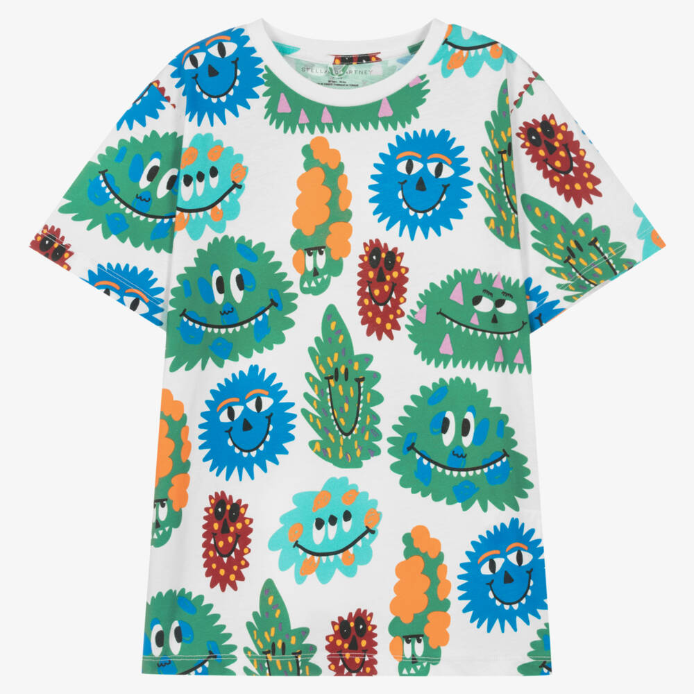 Ivory T-shirt for teen boys by British brand, Stella McCartney Kids, with a fun colourful, cartoon monster print. Cool and casual this quirky tee is made in soft and stretchy organic cotton jersey and has a classic ribbed crew neck. The Stella McCartney fit can be quite small so choose a size up if you want room to grow.