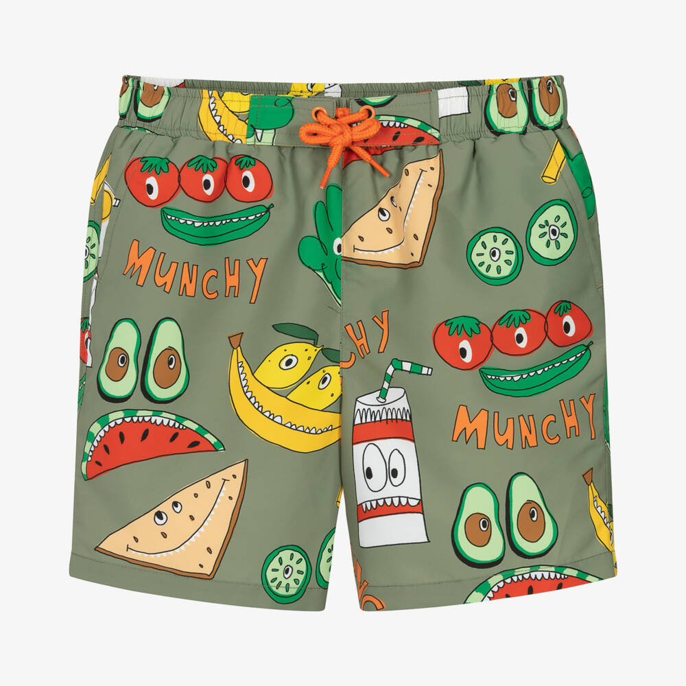 Fun khaki green swim shorts for teen boys from Stella McCartney Kids. They are patterned in colourful fruit, vegetable and drink cup characters with silly faces and 'lunchy munchy' lettering to complete the playful theme. Made in silky recycled fabric with a soft mesh lining, there are slanted front pockets, a velcro-fastening back pocket with eyelets and an orange cord to fasten the elasticated waist. The Stella McCartney fit can be quite small so choose a size up if you want room to grow.