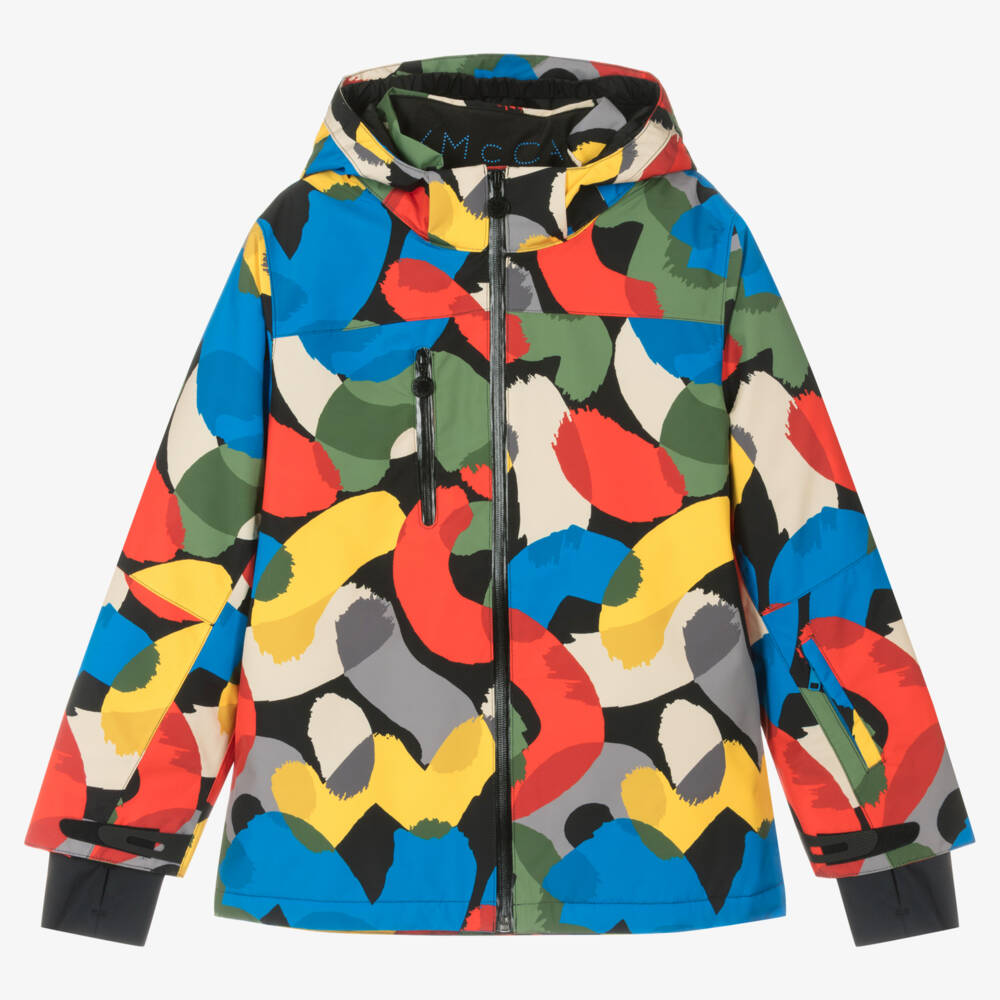 In a striking multicolour camouflage design, this ski jacket for teen boys is from Stella McCartney Kids. The designer's signature logo is printed inside the neckline, and there are zip-up pockets on the front with logo pulls. It has a zip-up ski pass pocket on the sleeve and internal media pockets with a headphone hole. There are mesh ventilation zips under the arms and stretchy thumbhole cuffs. Made from recycled fabric, it is waterproof, windproof and breathable. The hood is detachable and packs into the neck, and there is a popper-fastening snow skirt inside. The Stella McCartney fit can be quite small so choose a size up if you want room to grow.