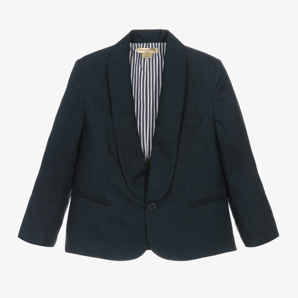 Smart navy blue linen blazer for teen boys by Stella McCartney Kids. Stylish and lightweight, it is designed with a shawl collar, three front pockets and a single vent at the back. The main lining is striped for an eye-catching contrast and is made in lightweight cotton for comfort. Completing the look, the jacket fastens with a single button on the front and has decorative buttons on the cuffs, all logo branded for a discreet designer touch. The Stella McCartney fit can be quite small so choose a size up if you want room to grow.