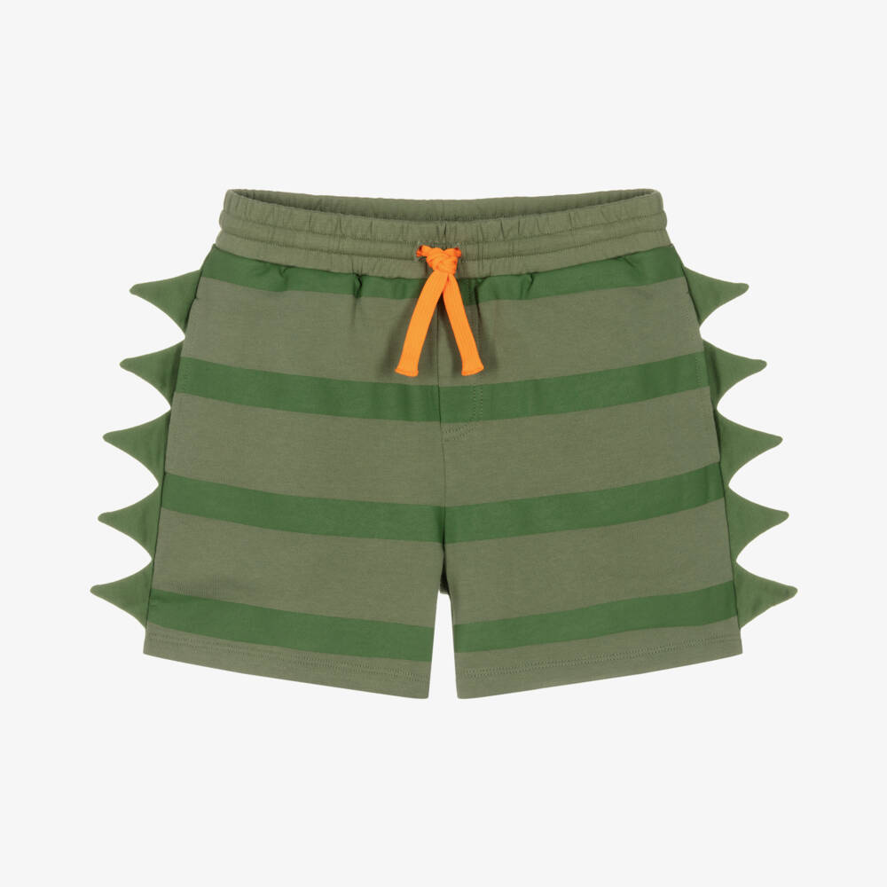 Green striped shorts for teen boys by Stella McCartney Kids, with fun 3D spines down the side seams. They are made in comfortable organic cotton jersey and have useful concealed side pockets. The waistband is elasticated and adjusts with a vibrant orange drawstring for an ideal fit. The Stella McCartney fit can be quite small so choose a size up if you want room to grow.