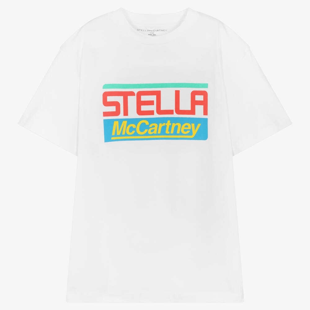 White organic cotton T-shirt for teen boys by British brand Stella McCartney Kids. Made in stretchy, comfortable jersey, it is a great everyday piece, with a colourful, sporty logo print and a classic crew neck.